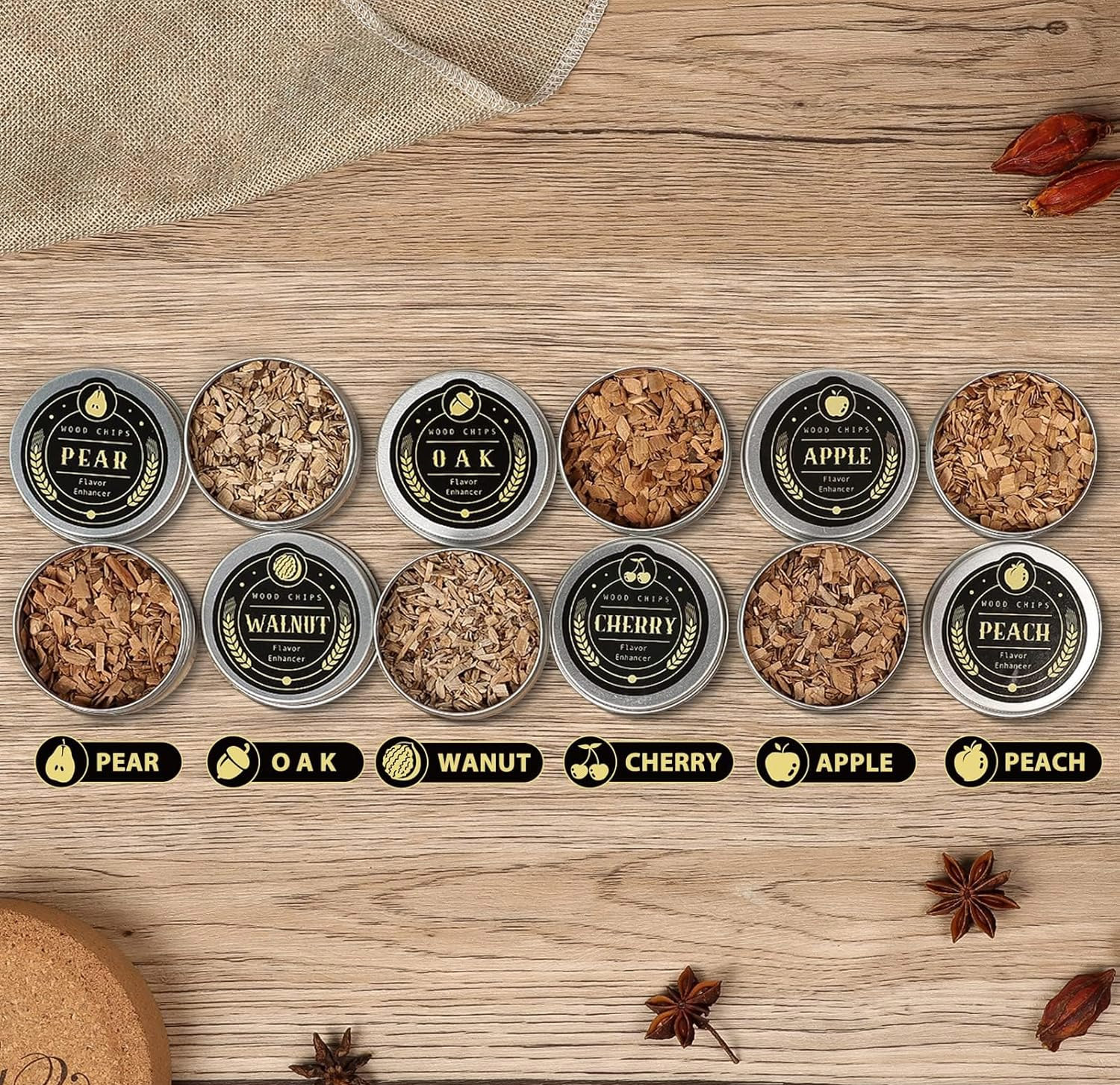 Περιλαμβάνει ξύλινο καπάκι καπνίσματος, 6 φυσικές ποικιλίες ροκανιδιών (αχλαδιά, καρυδιά, ροδάκινο, μήλο, κεράσι & δρυς), φακό (torch), 2 ανοξείδωτα φίλτρα και οδηγίες χρήσης.